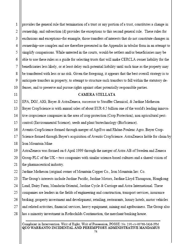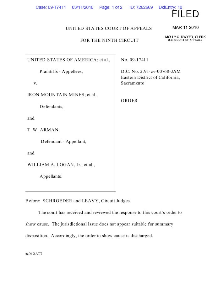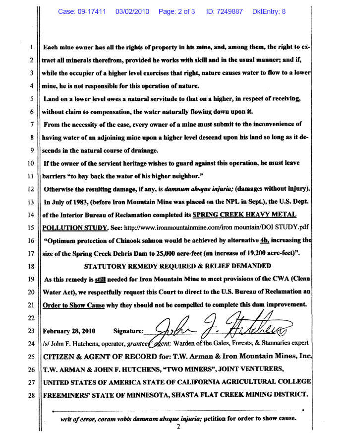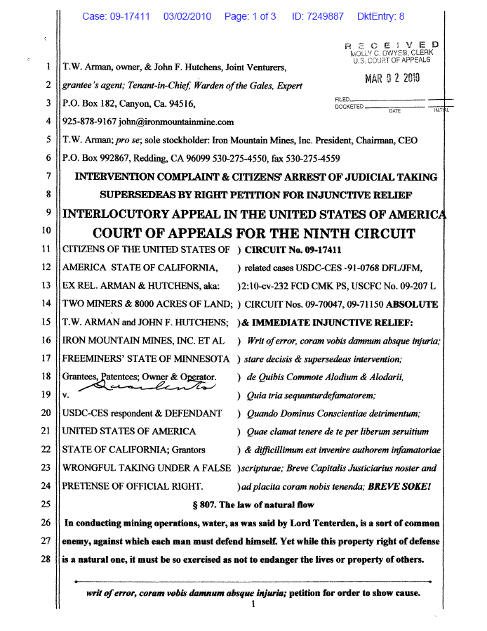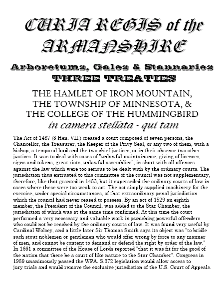 MR. T.W. "TED" ARMAN, OWNER OF IRON MOUNTAIN MINE, LTD., PRESIDENT, CHAIRMAN, CEO OF IRON MOUNTAIN MINES, INC. OWNER OF IRON MOUNTAIN MINE, IRON MOUNTAIN, THE COPPER MOUNTAIN MINING CO., MOUNTAIN COPPER CO., IRON MOUNTAIN INVESTMENT CO., THE ARMAN CONSOLIDATED MINES, THE ARMAN CONSOLIDATED MINING CLAIMS, THE ARMAN MINES EQUITABLE TRUSTS, THE ARMAN SOVEREIGN WAR ON POVERTY FUND, THE ARMAN MINES CHARITABLE FOUNDATION, THE ARMAN MINES MINISTRY OF NATURAL RESOURCES FEDERATION, THE ARMAN LOST CONFIDENCE MINE, THE ARMAN AGRICULTURAL COLLEGE, THE ARMAN MINES HAZARD AND REMEDIATION DIRECTORATE, THE ARMAN MINES DISASTER ASSISTANCE DIRECTORATE, AND THE ARMAN MINES HUMMINGBIRD INSTITUTE COLLEGE OF THE HUMMINGBIRD CENTER FOR HEALTH INSTITUTE FOR LIBERTY AND INDEPENDENCE.