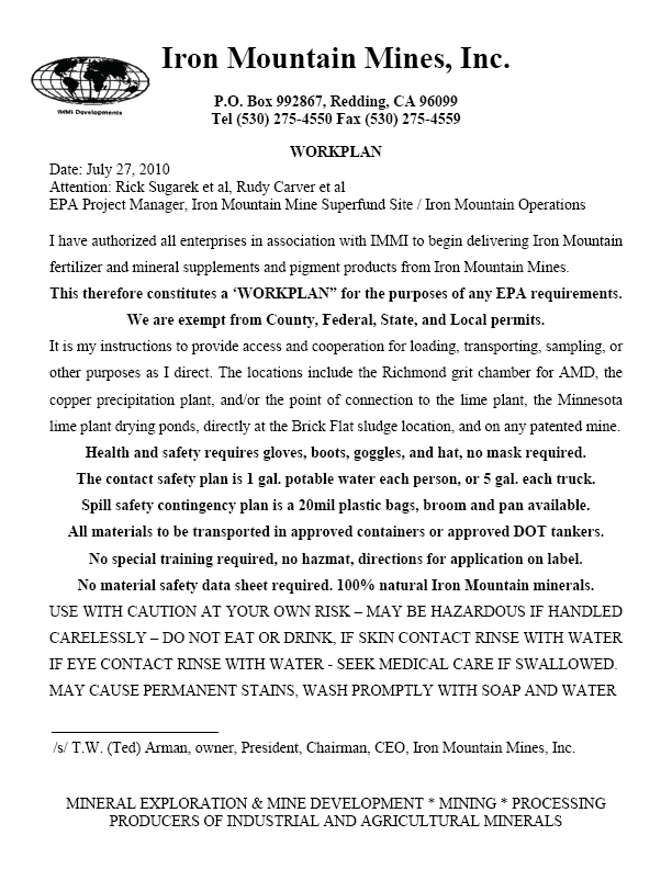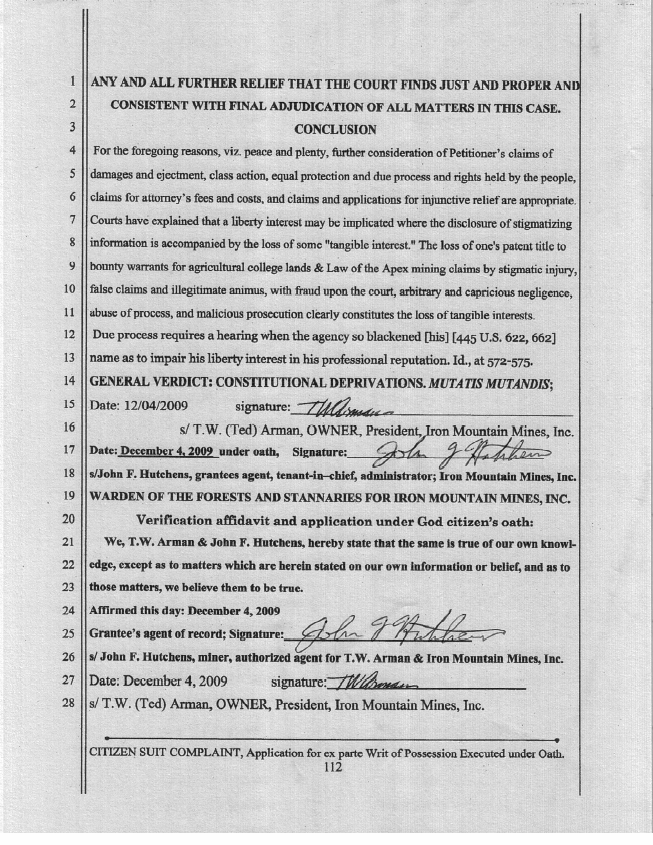 MR. T.W. "TED" ARMAN, INNOCENT VICTIM OF DISCRIMINATION BECAUSE OF PIGMENTS, PRESIDENT, CHAIRMAN, CEO OF IRON MOUNTAIN MINES, INC. OWNER OF IRON MOUNTAIN MINE, IRON MOUNTAIN, THE COPPER MOUNTAIN MINING CO., MOUNTAIN COPPER CO., IRON MOUNTAIN INVESTMENT CO., GRAN DUCADO DE ARMANSHIRE, THE ARMAN CONSOLIDATED MINES, THE ARMAN CONSOLIDATED MINING CLAIMS, THE ARMAN MINES EQUITABLE TRUSTS, THE ARMAN SOVEREIGN WAR ON POVERTY FUND, THE ARMAN MINES CHARITABLE FOUNDATION, THE ARMAN MINES MINISTRY OF NATURAL RESOURCES FEDERATION, THE ARMAN LOST CONFIDENCE MINE, THE ARMAN AGRICULTURAL COLLEGE CAMDEN AND MAGEE PAID IN GOLD MORILL LAND GRANT PATENTS, THE ARMAN BOUNTY WARRANTS OF MILITARY SCRIP TO SOLDIERS IN SERVICE TO THE NATION FREEHOLD ESTATE FOR 360 ACRES OF LAND IN LIEU OF LAND IN THE RANCHO SAN BUENAVENTURA GRANT PATENT TITLE FROM GOVERNOR NEWTON BOOTH AND PRESIDENT ABRAHAM LINCOLN PATENTS, CEO OF ESSENTIAL SOLUTIONS, INC., ONLY MEMBER OF IRON MOUNTAIN MINES, LLC.,VICTIM OF PREJUDICE TRADEMARK CO-OWNERS OF PEACEPIPE PIGMENTS, IRON MOUNTAIN PIGMENTS, AMERICAN PIGMENTS, CALIFORNIA PIGMENTS, MINNESOTA PIGMENTS, PIPESTONE PIGMENTS, WHITEHOUSE PIGMENTS, PRESIDENT PIGMENTS, SOVEREIGN PIGMENTS, FREEHOLD PIGMENTS, PATENT PIGMENTS, TITLE PIGMENTS, REDMAN PIGMENTS, PIRATE PIGMENTS, THUNDERBIRD PIGMENTS, MATHESON PIGMENTS, KESWICK PIGMENTS, JARDINE PIGMENTS, CALUMET PIGMENTS, CONGRESS PIGMENTS, DEPARTMENT PIGMENTS, PRICKAZ PIGMENTS, FEDERATION PIGMENTS, BUREAU PIGMENTS, COUNTY PIGMENTS, SHASTA PIGMENTS, BATTLE CREEK PIGMENTS, DEMOCRAT MOUNTAIN PIGMENTS, BAY PIGMENTS, BEAR PIGMENTS, BARE PIGMENTS, NATIVE PIGMENTS, ARMAN PIGMENTS, AMD&CSI, IMMI, HU/MOUNTAIN, ARMAN MINES MINISTRY OF NATURAL RESOURCES, THE ARMAN MINES MINISTRY OF MINERAL RESOURCES FEDERATION, THE ARMAN LOST HUMAN USE REMEDIATION AND RESTORATION TRUSTS, THE ARMAN MINERALS RESOURCE DEFENSE COUNCIL, THE GUYS OF JUSTICE, THE ARMAN MINES HAZARD AND REMEDIATION DIRECTORATE, THE ARMAN MINES DISASTER ASSISTANCE DIRECTORATE, AND THE ARMAN MINES HUMMINGBIRD INSTITUTE COLLEGE OF THE HUMMINGBIRD CENTER FOR HEALTH INSTITUTE FOR LIBERTY AND INDEPENDENCE. THE HUMMINGBIRD INSTITUTE IS ESTABLISHED AS A FOUNDATION FOR THE CARE OF THE IRON MOUNTAIN CHRIST STATUE AND SPIRITUAL RETREAT. Fiat justitia, pereat mundus; tu ne cede malis, sed contra audentior ito Sub specie mali : The stream of thought flows on; but most of its segments fall into the bottomless abyss of oblivion. Of some, no memory survives the instant of their passage. Of others, it is confined to a few moments, hours or days. Others, again, leave vestiges which are indestructible, and by means of which they may be recalled as long as life endures. -William James