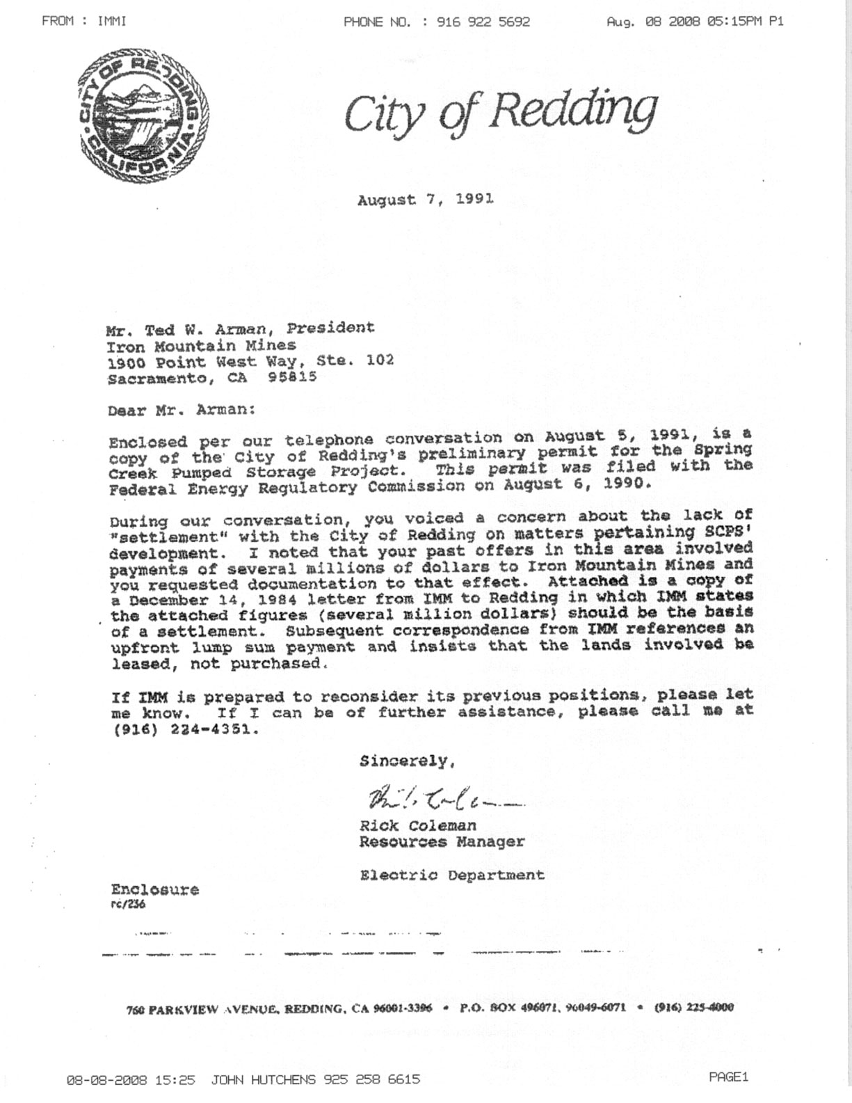 Corrections: "Sacramento River"; is a waterbody properly known as Keswick Lake; "Spring Creek Reservoir" is not a resrvoir, It is a debris dam.